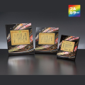 素材:MDF(木粉圧縮エコ材)製黒エポ塗装楯、楯板に特殊な銀シート加工、黒色アクリル製板に真鍮ゴールドプレート付き