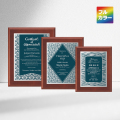 素材:スプルス材面取塗装楯、ステンレス製シルバープレート付き、プレートの柄はオーバーレイドプリント、B,Cサイズは壁掛け兼用楯足付き(特許取得済)