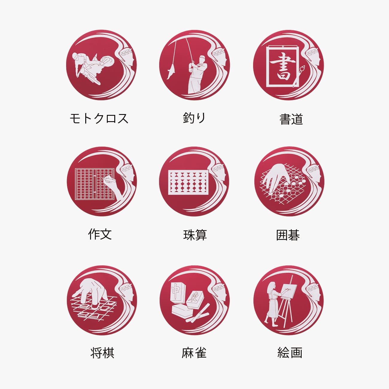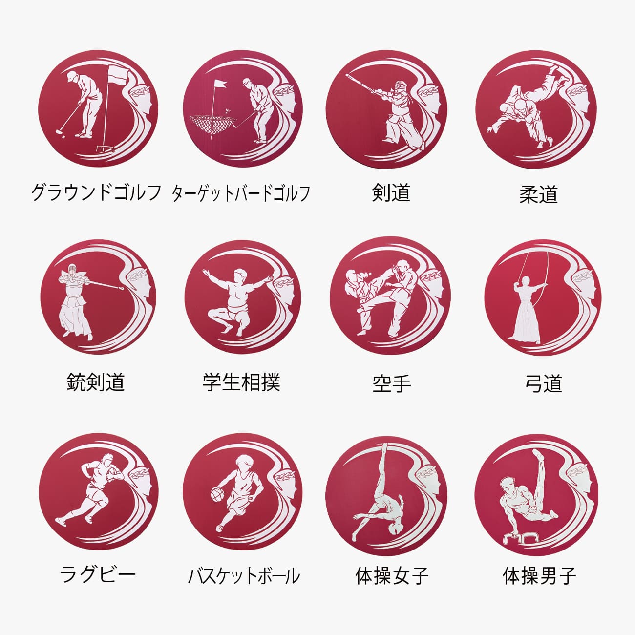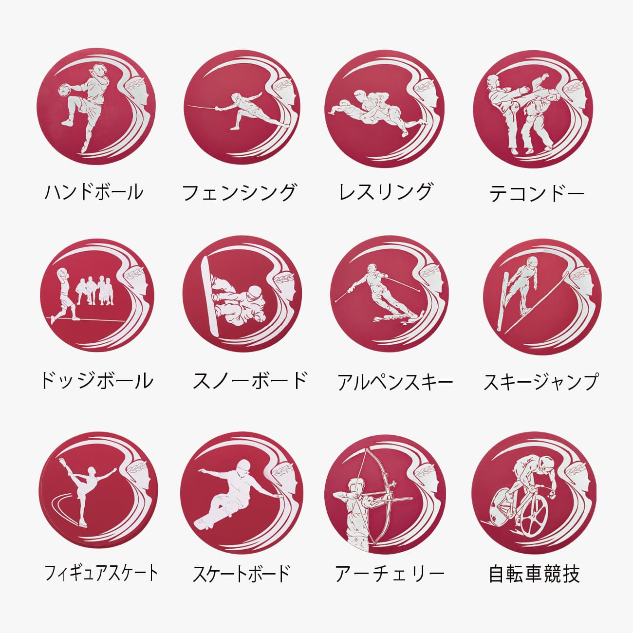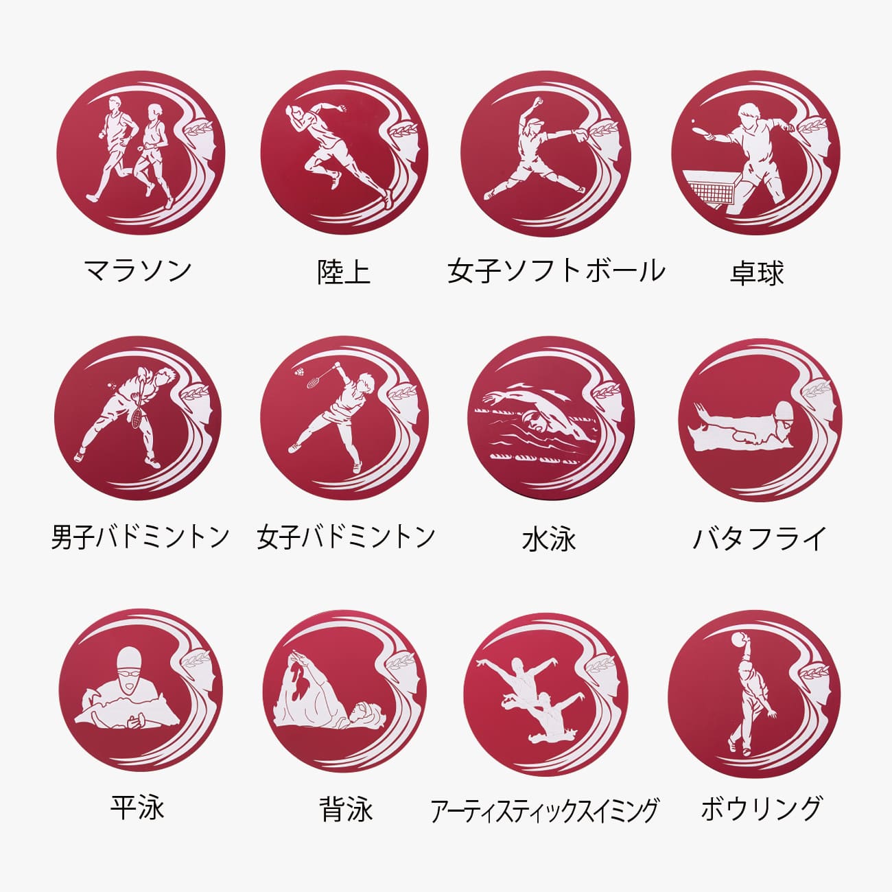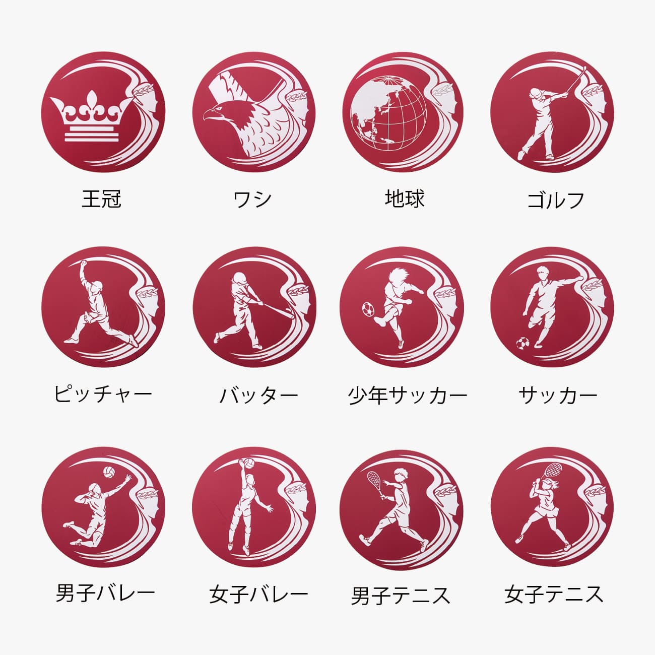 この商品のオプション一覧: 王冠, ワシ, 地球, ゴルフ, ピッチャー, バッター, 少年サッカー, サッカー, 男子バレー, 女子バレー, 男子テニス, 女子テニス, マラソン, 陸上, 女子ソフトボール, 卓球, 男子バドミントン, 女子バドミントン, 水泳, バタフライ, 平泳, 背泳, アーティスティックスイミング, ボウリング, グラウンドゴルフ, ターゲットバードゴルフ, 剣道, 柔道, 銃剣道, 学生相撲, 空手, 弓道, ラグビー, バスケットボール, 体操女子, 体操男子, ハンドボール, フェンシング, レスリング, テコンドー, ドッジボール, スノーボード, アルペンスキー, スキージャンプ, フィギュアスケート, スケートボード, アーチェリー, 自転車競技, モトクロス, 釣り, 書道, 作文, 珠算, 囲碁, 将棋, 麻雀, 絵画, 演劇, 合唱, 吹奏楽, カメラ, 警察マーク, 消防団マーク,