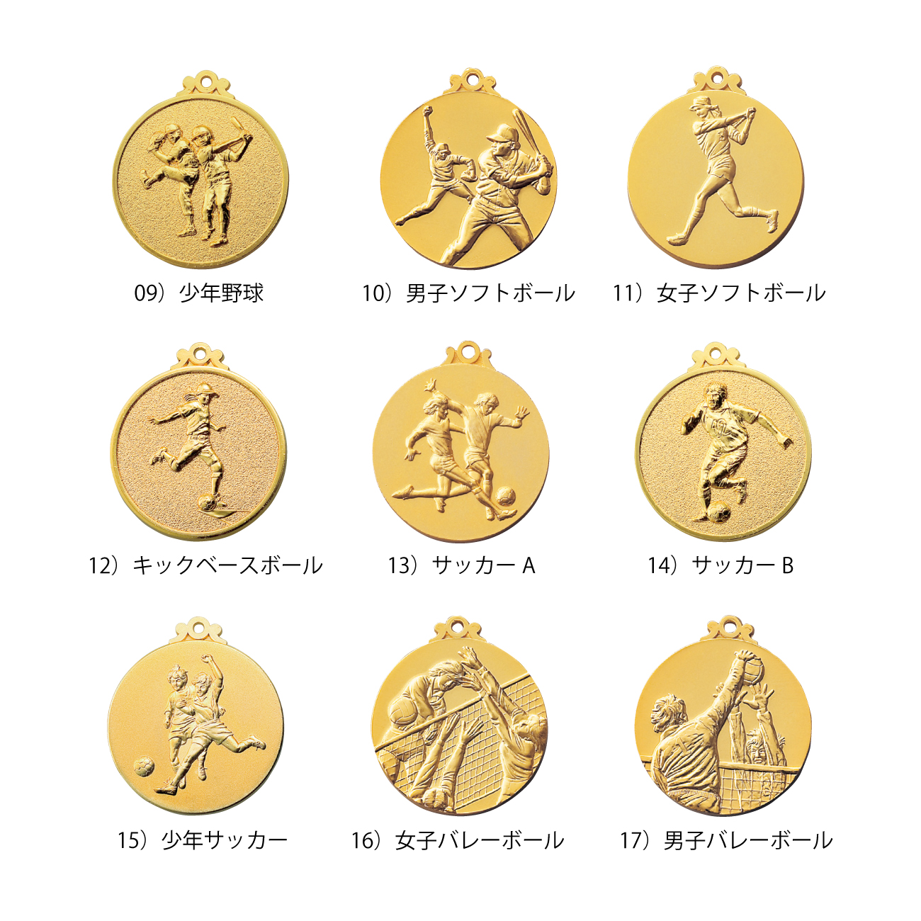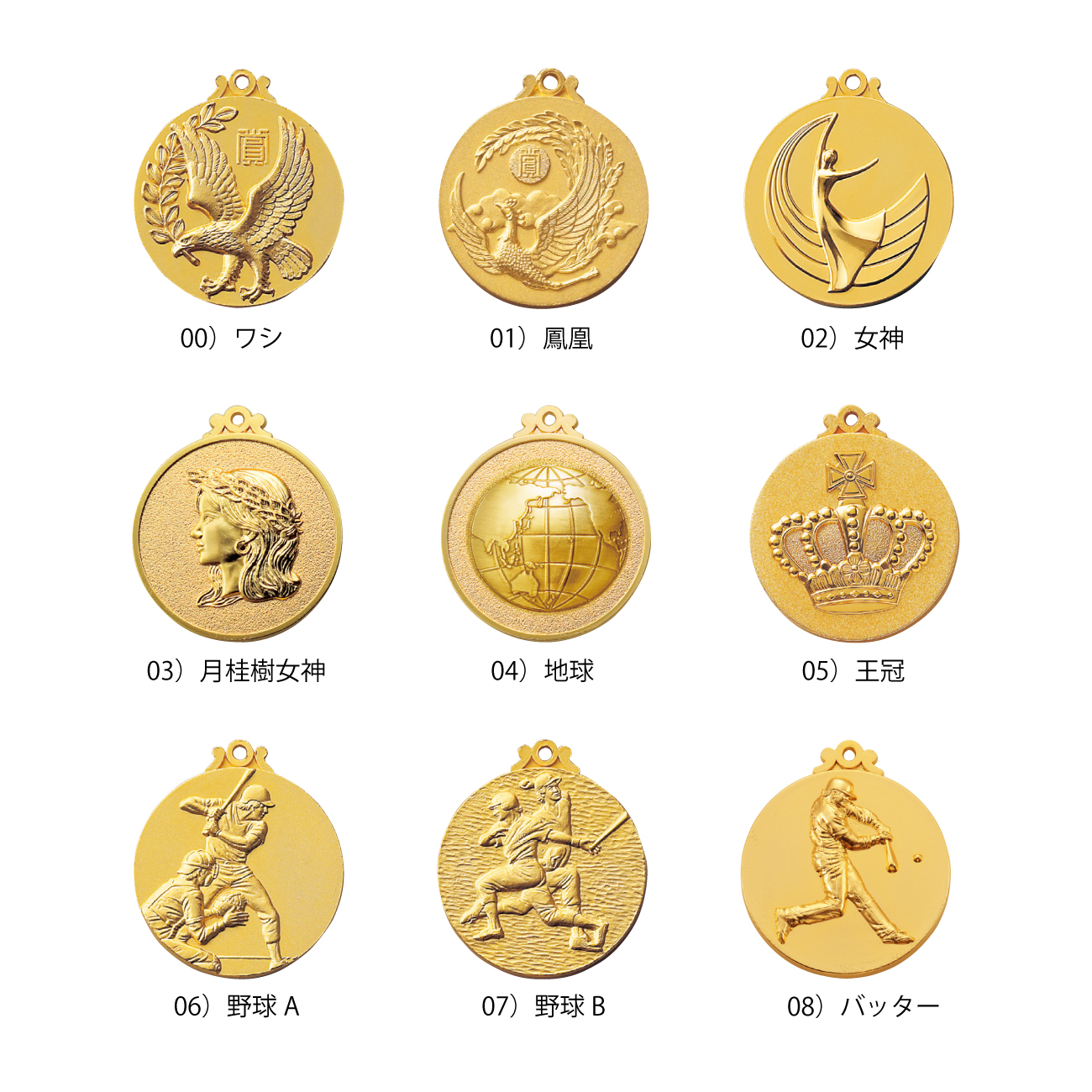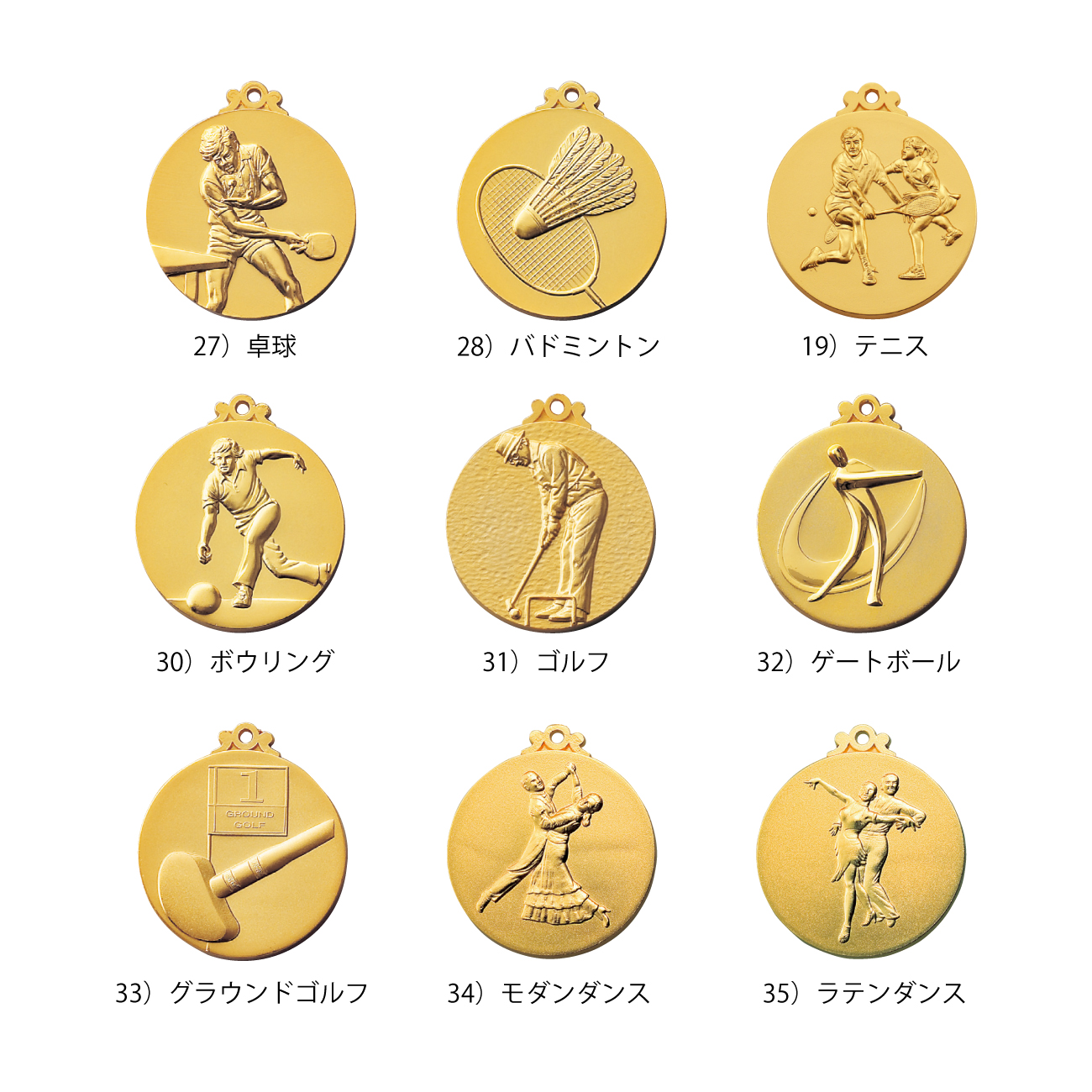 00)ワシ, 01)鳳凰, 02)女神, 03)月桂樹女神, 04)地球, 05)王冠, 06)野球A, 07)野球B, 08)バッター, 09)少年野球, 10)男子ソフトボール, 11)女子ソフトボール, 12)キックベースボール, 13)サッカーA, 14)サッカーB, 15)少年サッカー, 16)女子バレーボール, 17)男子バレーボール, 18)バスケットボール, 19)ランナー, 20)陸上, 21)水泳, 22)剣道, 23)柔道, 24)すもう, 25)空手A, 26)空手B, 27)卓球, 28)バドミントン, 29)テニス, 30)ボウリング, 31)ゴルフ, 32)ゲートボール, 33)グラウンドゴルフ, 34)モダンダンス, 35)ラテンダンス,