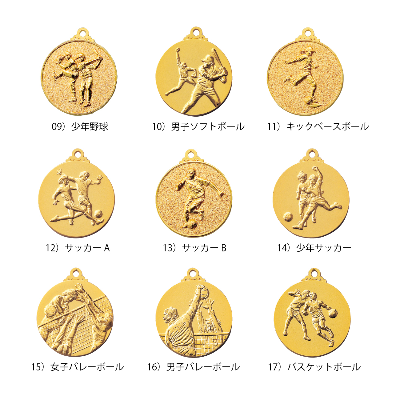 01)鳳凰, 02)女神, 03)月桂樹女神, 04)地球, 05)王冠, 06)野球A, 07)野球B, 08)バッター, 09)少年野球, 10)男子ソフトボール, 11)キックベースボール, 12)サッカーA, 13)サッカーB, 14)少年サッカー, 15)女子バレーボール, 16)男子バレーボール, 17)バスケットボール, 18)ランナー, 19)水泳, 20)剣道, 21)柔道, 22)すもう, 23)空手A, 24)空手B, 25)卓球, 26)バドミントン, 27)テニス, 28)ゴルフ, 29)ゲートボール, 30)グラウンドゴルフ,