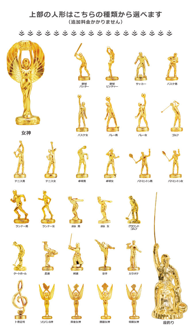この商品のオプション一覧: 女神[104mm], 野球 バッター[114mm], 野球 ピッチャー[90mm], サッカー[79mm], バスケットボール 男[89mm], バスケットボール 女[108mm], バレーボール 男[94mm], バレーボール 女[103mm], ゴルフ[86mm], テニス 男[104mm], テニス 女[101mm], 卓球 男[90mm], 卓球 女[83mm], バドミントン 男[84mm], バドミントン 女[80mm], ランナー 男[76mm], ランナー 女[80mm], 水泳 男[83mm], 水泳 女[75mm], グラウンドゴルフ[79mm], ゲートボール[78mm], 柔道[84mm], 剣道[111mm], 空手[88mm], カラオケ[84mm], ト音記号[99mm], ソロバン女神[110mm], 麻雀女神[107mm], 囲碁女神[110mm], 王将女神[105mm], 座釣り,
