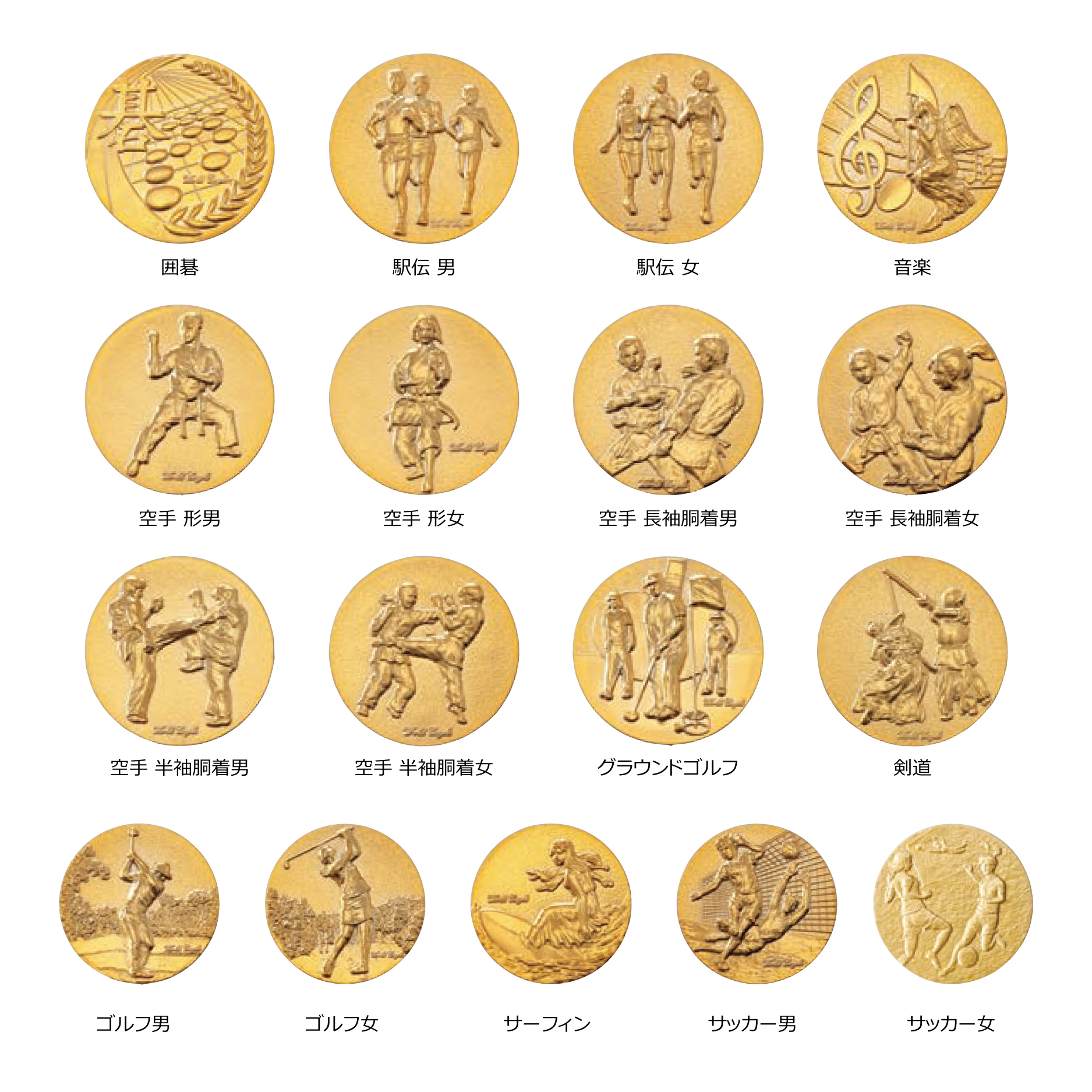 囲碁, 駅伝男, 駅伝女, 音楽, 空手形男, 空手形女, 空手長袖胴着男, 空手長袖胴着女, 空手半袖胴着男, 空手半袖胴着女, グラウンドゴルフ, 剣道, ゴルフ男, ゴルフ女, サーフィン, サッカー男, 柔道男, 柔道女, 将棋, 勝者男女, 書道, 水泳, スケートボード, スタンダードダンス, スポーツクライミング, 相撲, ソフトボール男, ソフトボール女, そろばん, 卓球男, 卓球女, 地球, テニス男, テニス女, パークゴルフ, バスケット男, バスケット女, バトミントン男, バトミントン女, バレー男, バレー女, ハンドルボール, フットサル, 鳳凰, ボウリング, 麻雀, マラソン男, マラソン女, 女神A, 女神B, 野球A, 野球B, ラグビー, ラテンダンス, ランナー男, ランナー女, 和弓, ワシ,