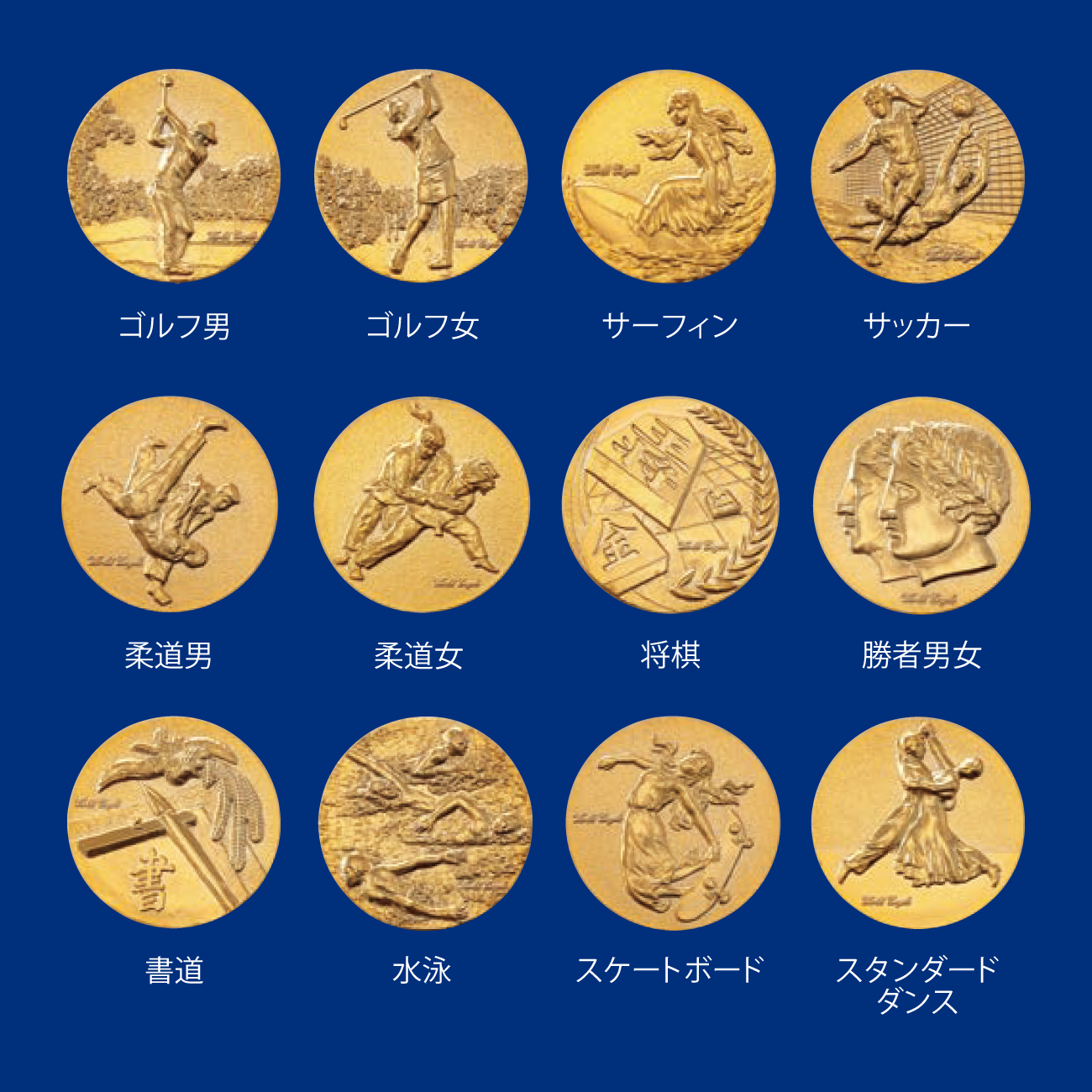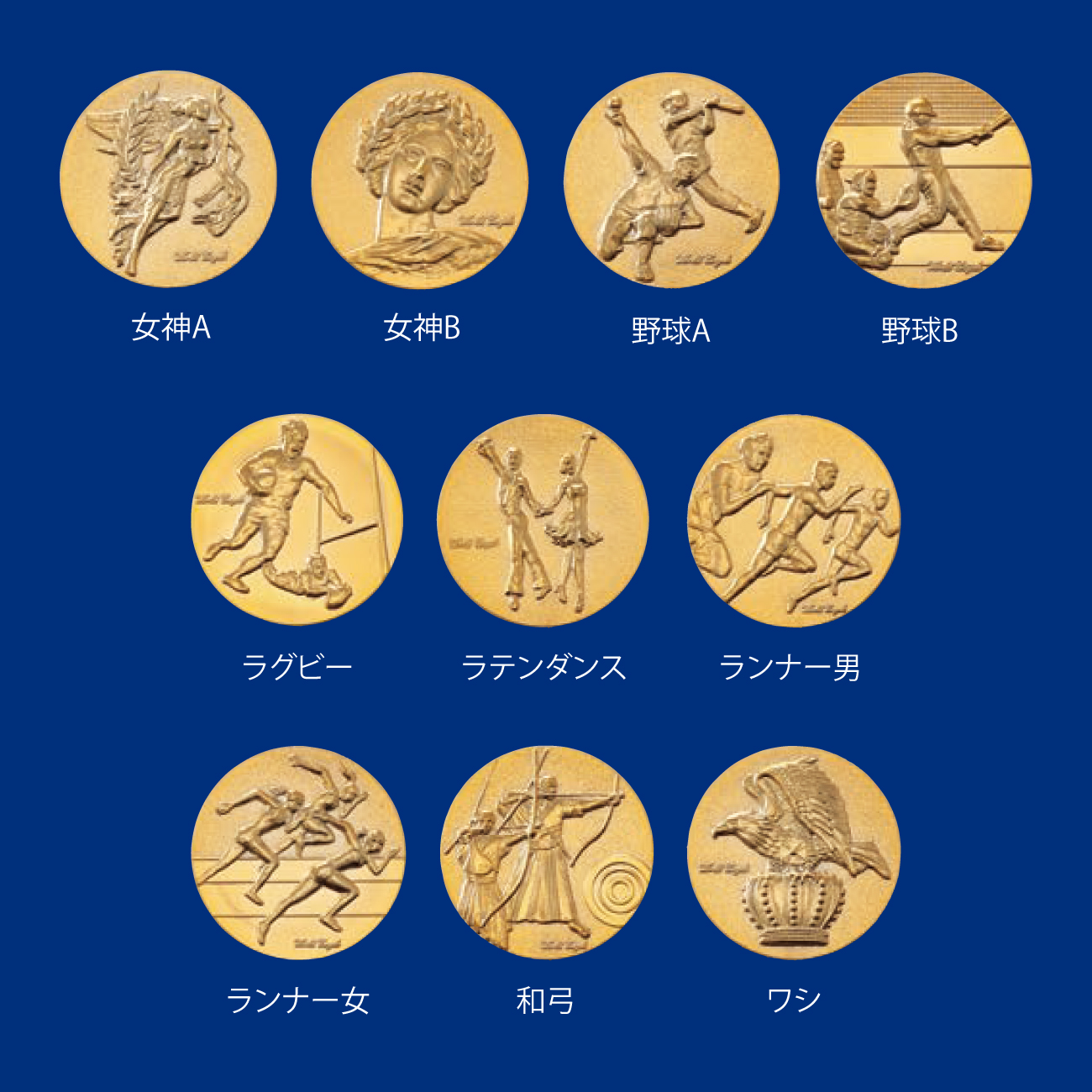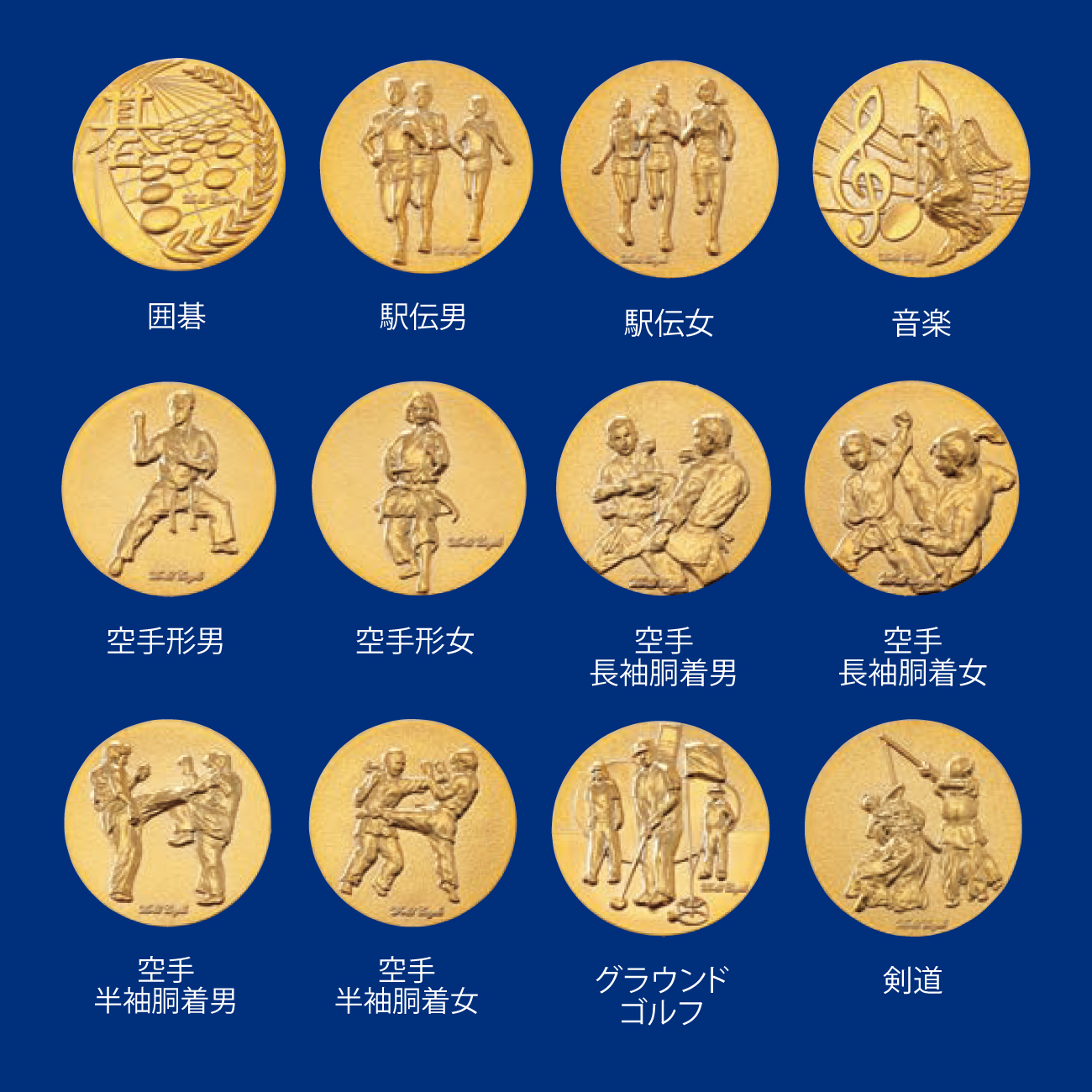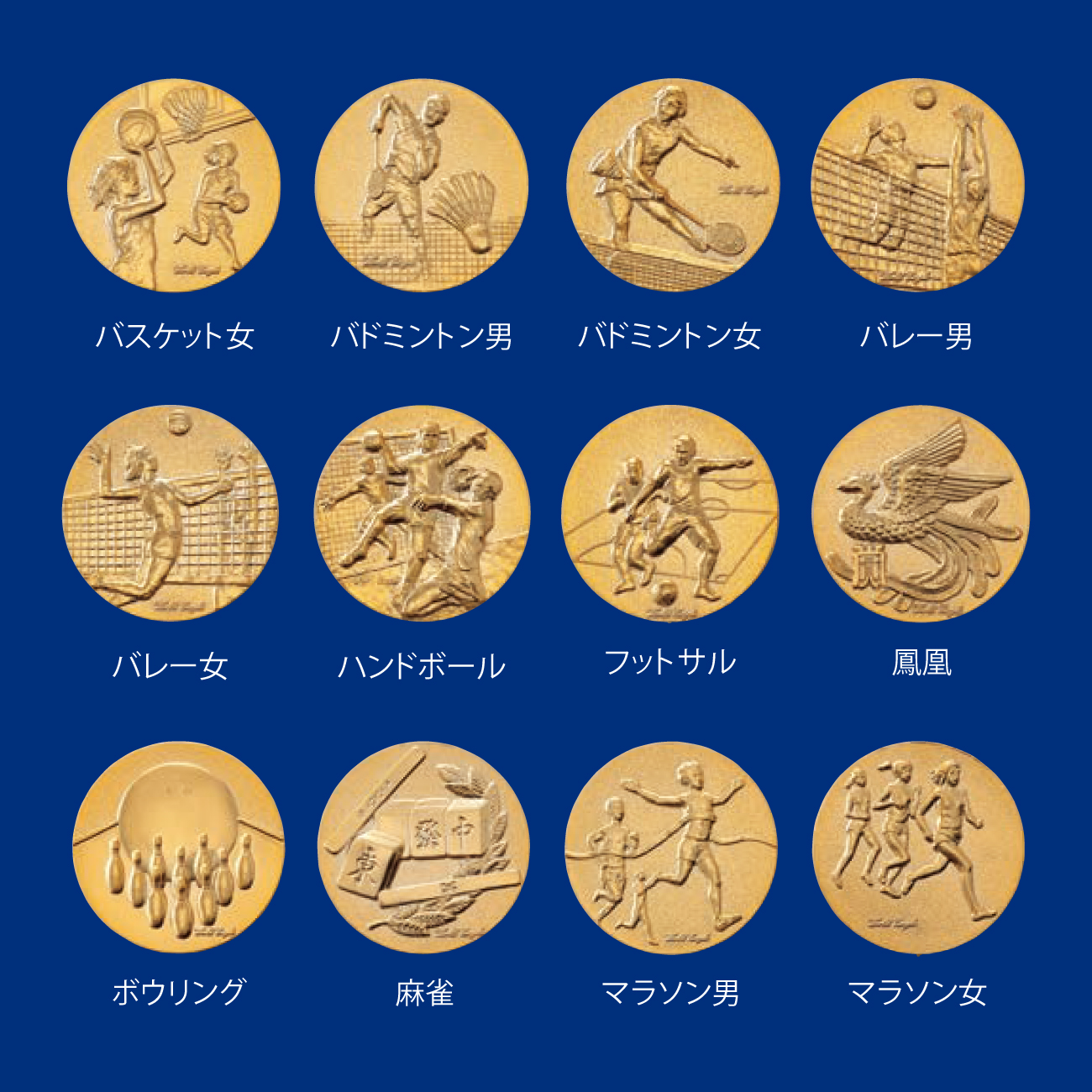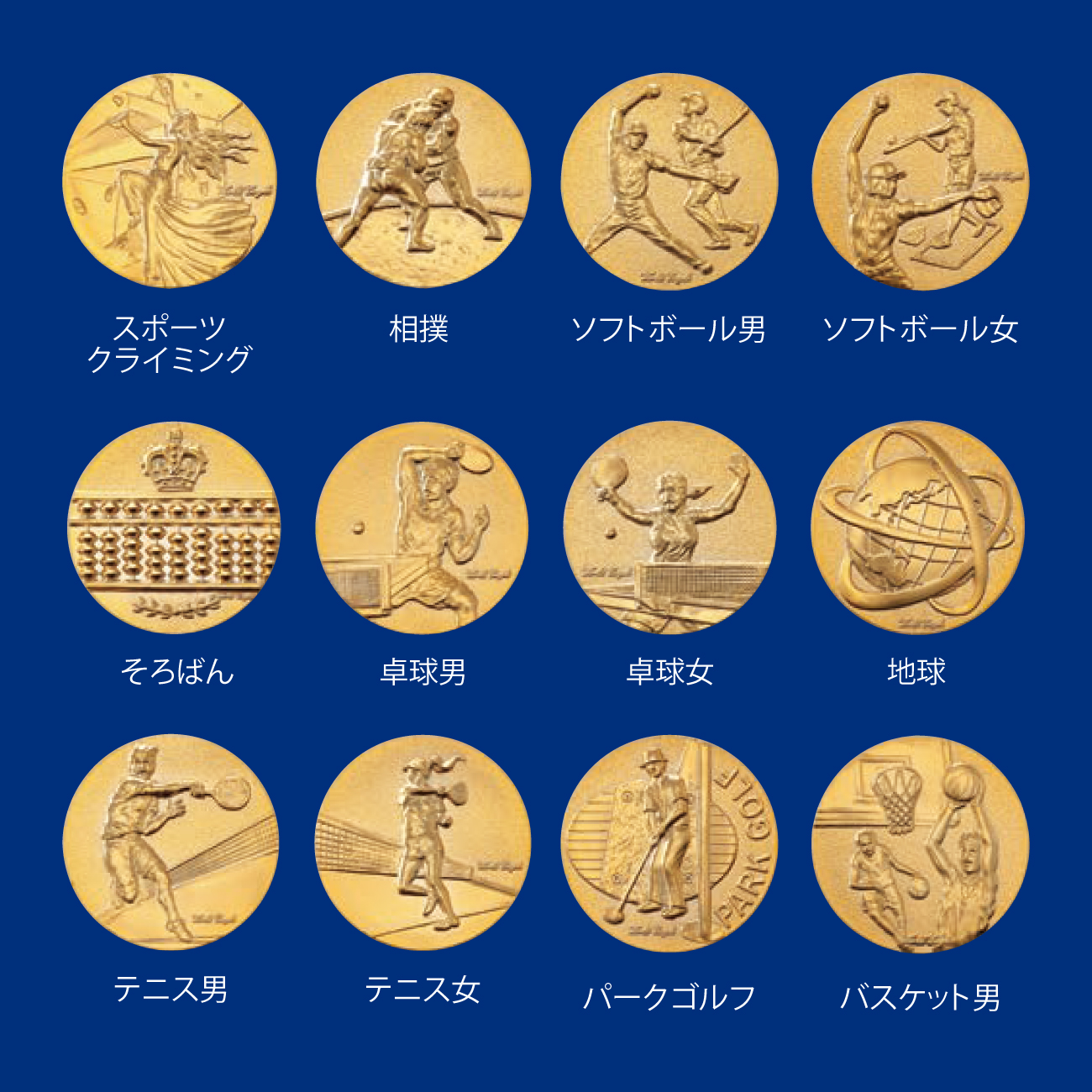 囲碁, 駅伝男, 駅伝女, 音楽, 空手形男, 空手形女, 空手長袖胴着男, 空手長袖胴着女, 空手半袖胴着男, 空手半袖胴着女, グラウンドゴルフ, 剣道, ゴルフ男, ゴルフ女, サーフィン, サッカー男, 柔道男, 柔道女, 将棋, 勝者男女, 書道, 水泳, スケートボード, スタンダードダンス, スポーツクライミング, 相撲, ソフトボール男, ソフトボール女, そろばん, 卓球男, 卓球女, 地球, テニス男, テニス女, パークゴルフ, バスケット男, バスケット女, バトミントン男, バトミントン女, バレー男, バレー女, ハンドルボール, フットサル, 鳳凰, ボウリング, 麻雀, マラソン男, マラソン女, 女神A, 女神B, 野球A, 野球B, ラグビー, ラテンダンス, ランナー男, ランナー女, 和弓, ワシ,