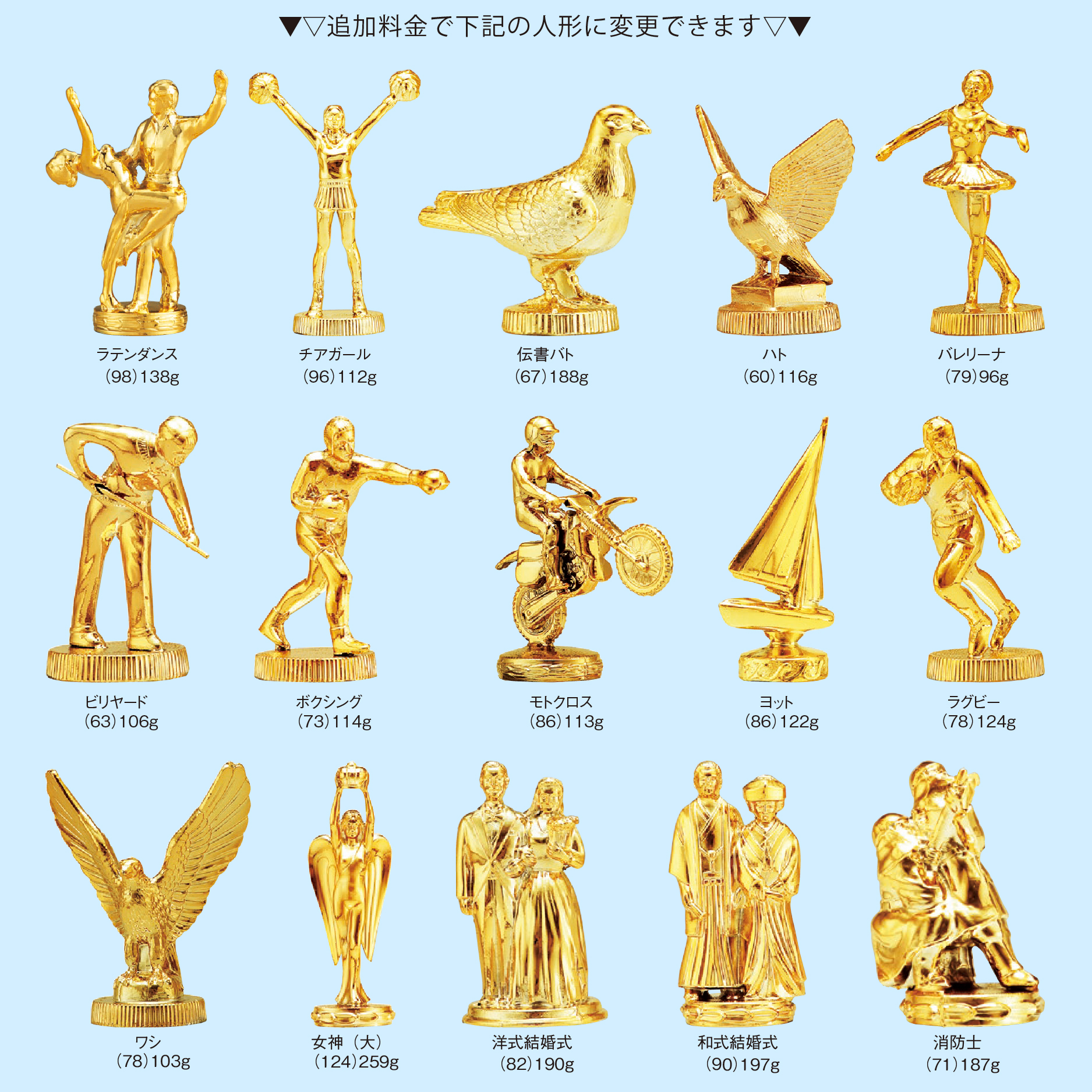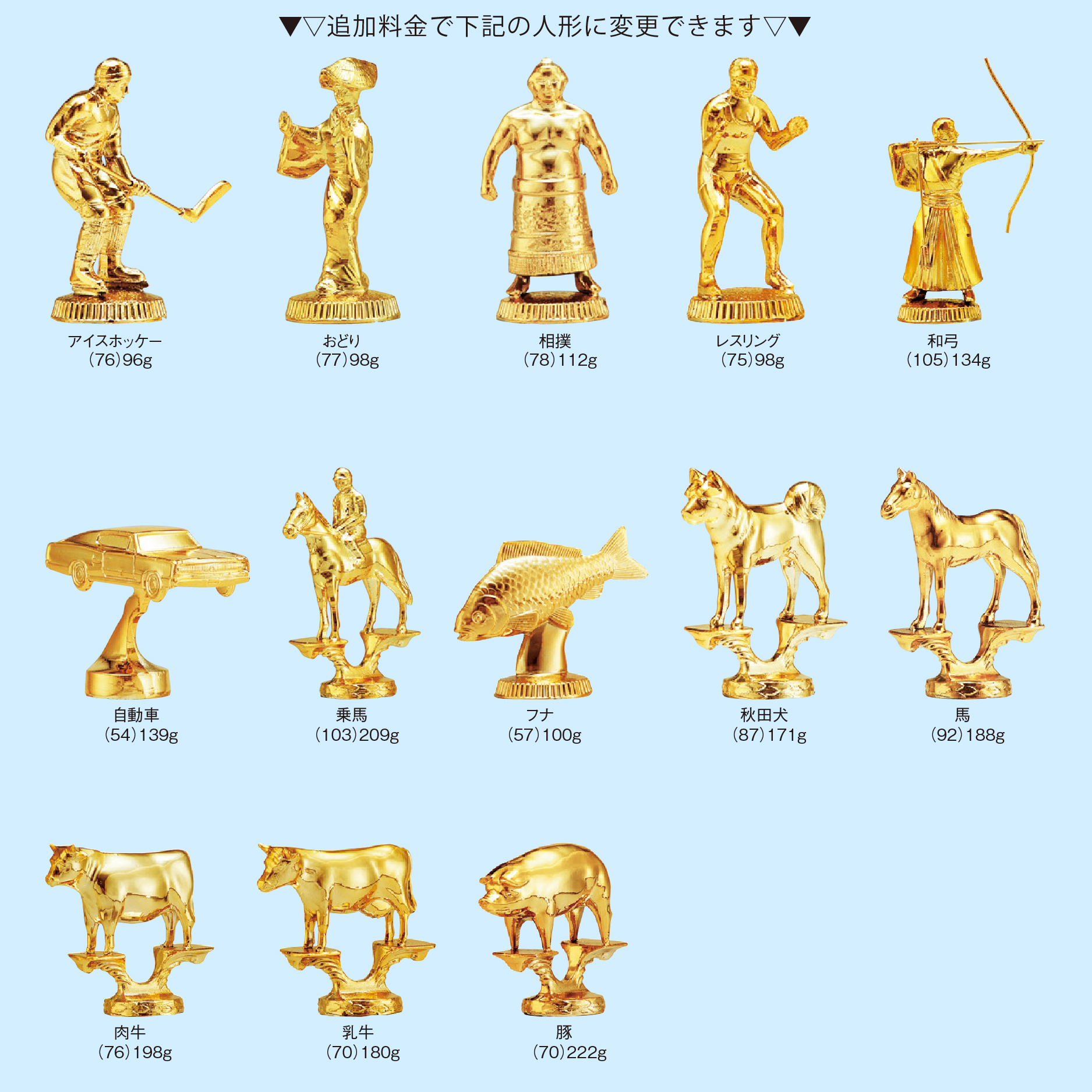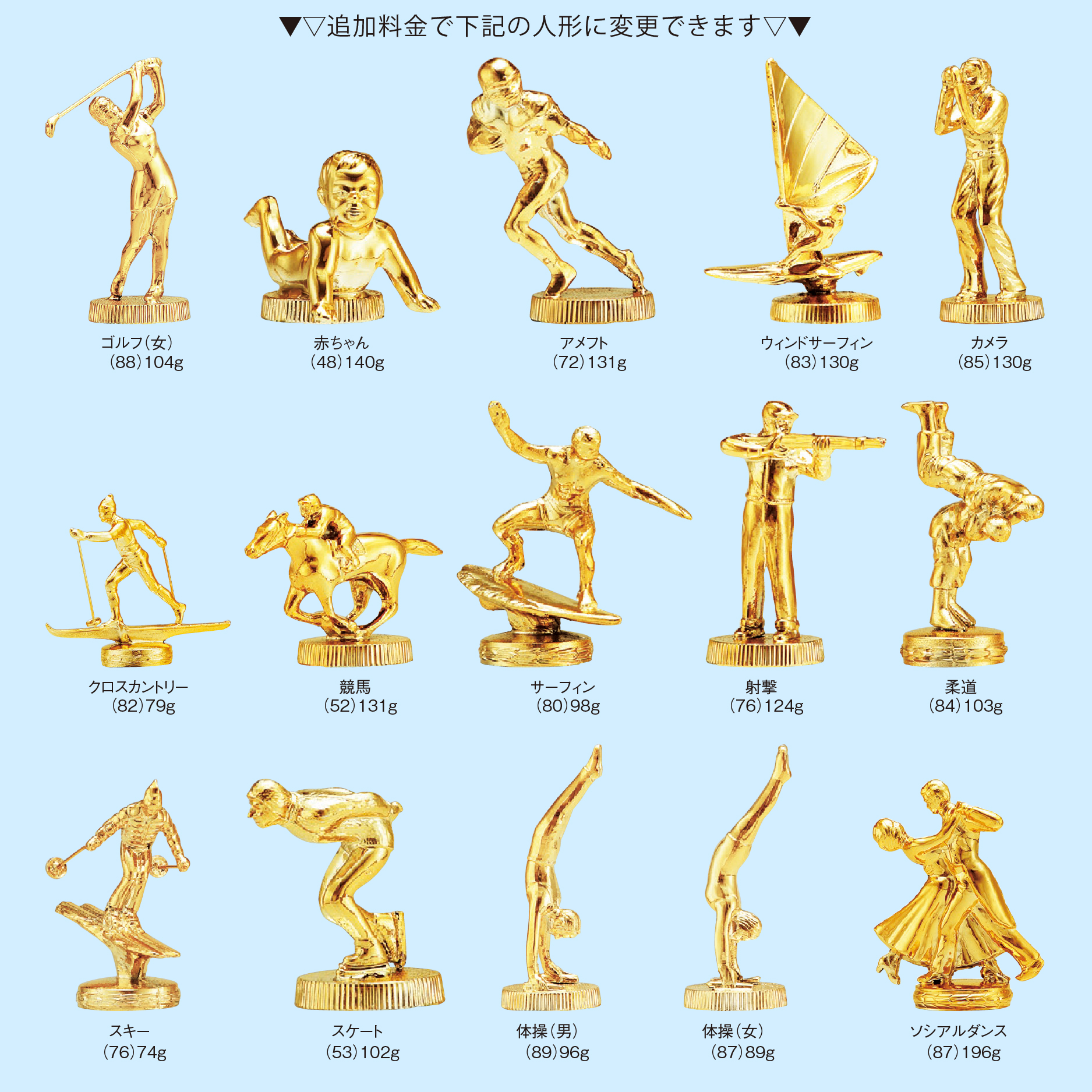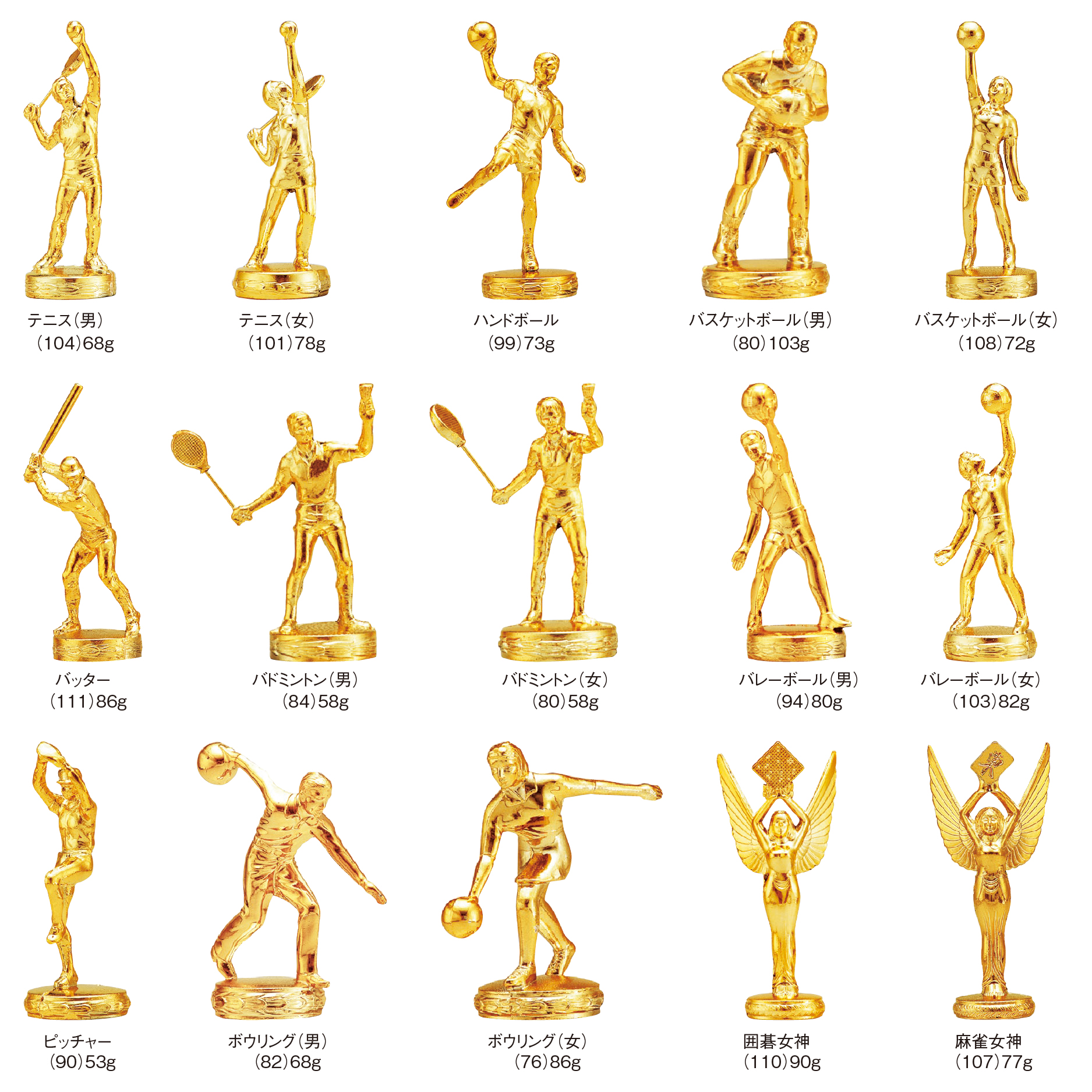 この商品のオプション一覧: 女神 (万能)〔104mm〕, ト音記号 〔99mm〕, カラオケ 〔84mm〕, 空手道 〔88mm〕, グラウンドゴルフ 〔79mm〕, 剣道 〔111mm〕, ゴルフ (男)〔86mm〕, バスケットボール (男)〔80mm〕, バスケットボール (女)〔108mm〕, バッター 〔111mm〕, サッカー 〔79mm〕, 水泳 (男)〔76mm〕, 水泳 (女)〔76mm〕, 学生相撲 〔62mm〕, ソフトボール (男)〔79mm〕, バドミントン (男)〔84mm〕, バドミントン (女)〔80mm〕, バレーボール (男)〔94mm〕, ソフトボール (女)〔78mm〕, 卓球 (男)〔90mm〕, 卓球 (女)〔83mm〕, バレーボール (女)〔103mm〕, ピッチャー 〔90mm〕, ボウリング (男)〔82mm〕, ボウリング (女)〔76mm〕, 囲碁女神 〔110mm〕, テニス (男)〔104mm〕, テニス (女)〔101mm〕, ハンドボール 〔99mm〕, 王将女神 〔105mm〕, ソロバン女神 〔110mm〕, 麻雀女神 〔107mm〕, ランナー (男)〔76mm〕, ランナー (女)〔80mm〕, ゴルフ (女)〔88mm〕, 赤ちゃん 〔48mm〕, アメフト 〔72mm〕, ウィンドサーフィン 〔83mm〕, カメラ 〔85mm〕, クロスカントリー 〔82mm〕, 競馬 〔52mm〕, サーフィン 〔80mm〕, 射撃 〔76mm〕, 柔道 〔84mm〕, スキー 〔76mm〕, スケート 〔53mm〕, 体操 (男)〔89mm〕, 体操 (女)〔87mm〕, ソシアルダンス 〔87mm〕, ラテンダンス 〔98mm〕, チアガール 〔96mm〕, 伝書バト 〔67mm〕, ハト 〔60mm〕, バレリーナ 〔79mm〕, ビリヤード 〔63mm〕, ボクシング 〔73mm〕, モトクロス 〔86mm〕, ヨット 〔86mm〕, ラグビー 〔78mm〕, ワシ 〔78mm〕, 女神 (大)〔124mm〕, 洋式結婚式 〔82mm〕, 和式結婚式 〔90mm〕, 消防士 〔71mm〕, アイスホッケー 〔76mm〕, おどり 〔77mm〕, 相撲 〔78mm〕, レスリング 〔75mm〕, 和弓 〔105mm〕, 自動車 〔54mm〕, 乗馬 〔103mm〕, フナ 〔57mm〕, 秋田犬 〔87mm〕, 馬 〔92mm〕, 肉牛 〔76mm〕, 乳牛 〔70mm〕, 豚 〔70mm〕,
